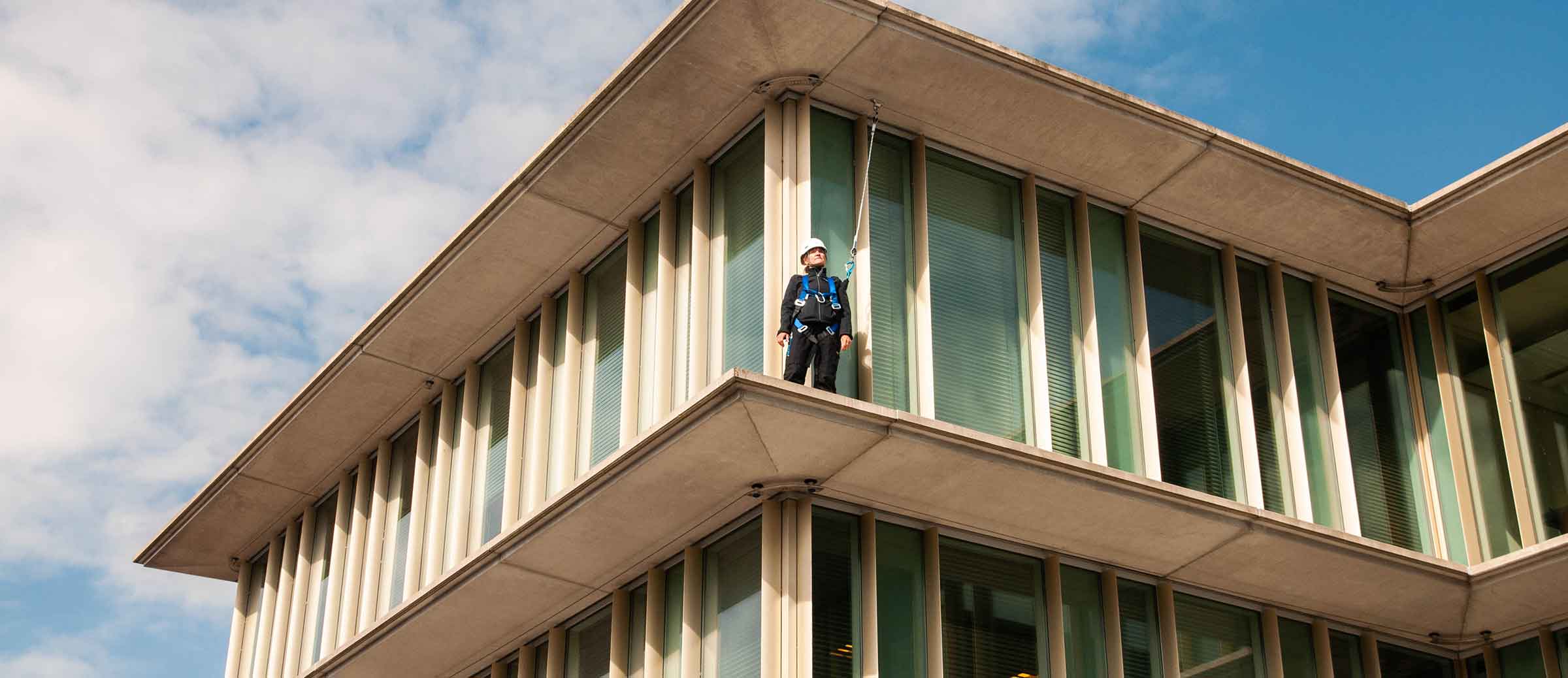 Er is een toenemende vraag naar oplossingen voor ramen wassen in onze projecten, met name voor smalle randjes waar traditionele valbeveiligingsmethoden niet geschikt zijn. Om de veiligheid van ramenwassers die op hoogte werken te waarborgen, hadden we een oplossing nodig die valbeveiliging bood zonder de esthetiek van het gebouw in gevaar te brengen. Het installeren van leuningen of collectieve valbeveiliging op balkons was geen optie, dus een leeflijnsysteem boven het hoofd van de werknemers kan de enige oplossing zijn.